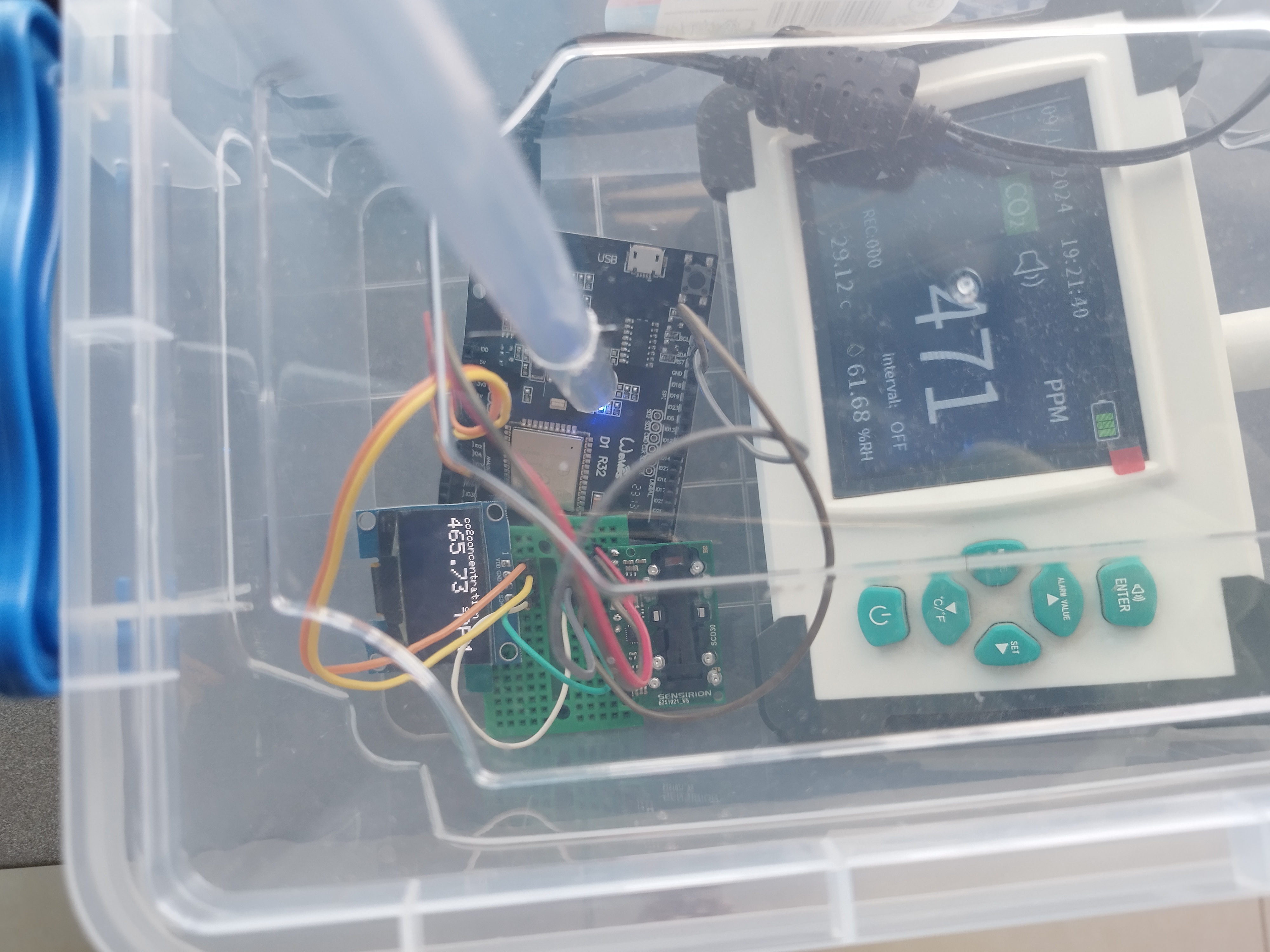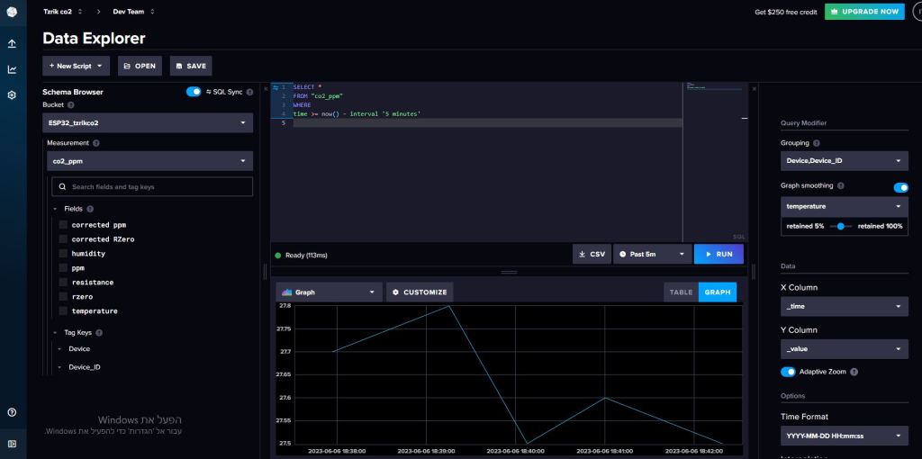 וכמובן, מיקרוקונטרולר ESP 32 עם חיישני לחות, טמפרטורה ורמת פחמן דו חמצני, שמעביר את הנתונים למאגר נתונים InfluxDB (על תשתית AWS) דרך WIFI